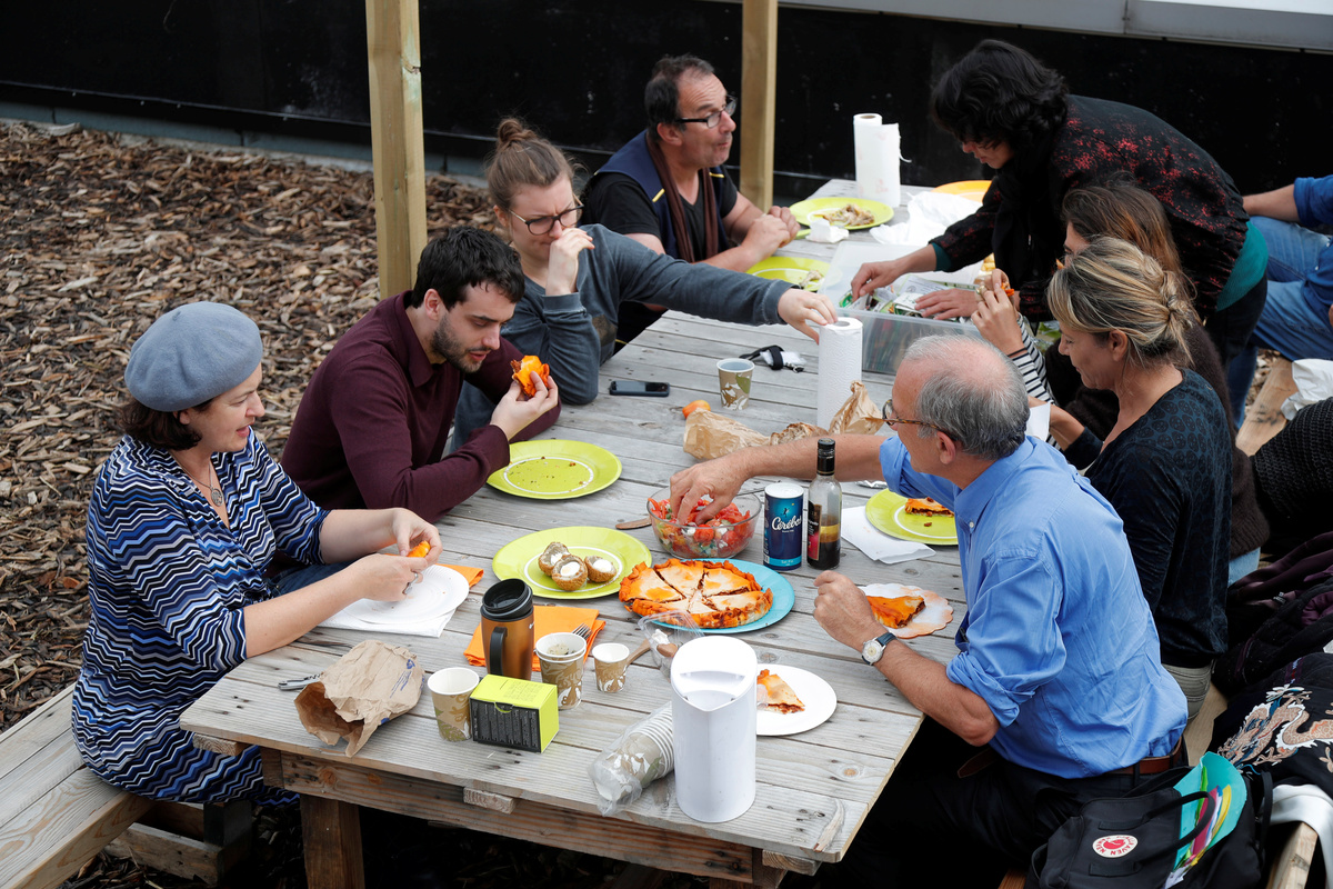 Poste office employees eat a lunch with products from a 900 square meters farm garden on the rooftop of their postal sorting center, as part of a project by Facteur Graine association to transform a city rooftop as a vegetable garden to grow fruits, vegetables, aromatic and medicinal plants, with also chickens and bees in Paris, France, September 22, 2017. Picture taken September 22, 2017. REUTERS/Charles Platiau