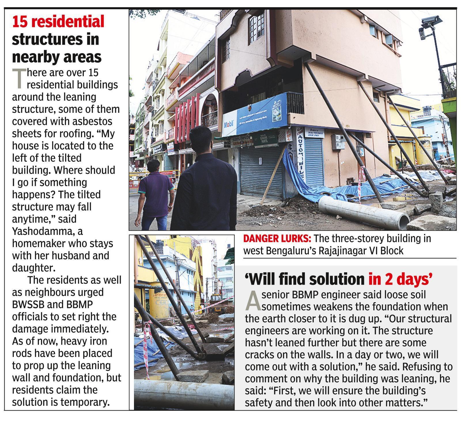 BENGALURU: A three-storey building in west Bengaluru’s Rajajinagar VI Block developed cracks and was leaning dangerously to its left after BWSSB workers reportedly dug up the earth next to its foundation while fixing sewage pipelines.