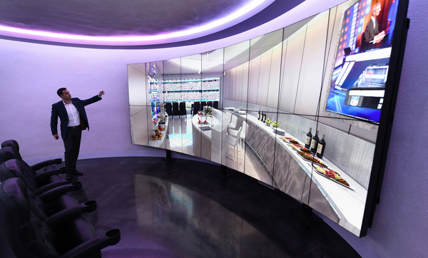 The key stop for potential suite owners is a circular room with a floor-to-ceiling curved video board and four stadium-style seats in front. Instead of building mockups of all seven suite types, designers found a digital solution. Controlled by a small tablet, the screen provides an immersive walk-through of each suite. You can check out everything: field view, food, even the sink.
