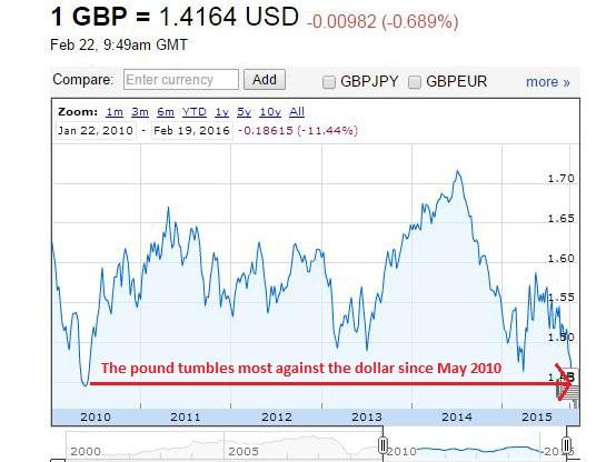 The pound dropped 1.65 per cent against the dollar to $1.4163 in morning trading on Monday, the biggest one-day drop since the general election in May 2010.