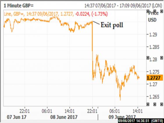 Sterling shed almost 2 per cent against the dollar to $1.2731 immediately after the bombshell exit poll was published at 10pm on Thursday night and fell as low as $1.2664 on Friday morning - putting the currency on course for its biggest drop since last October.