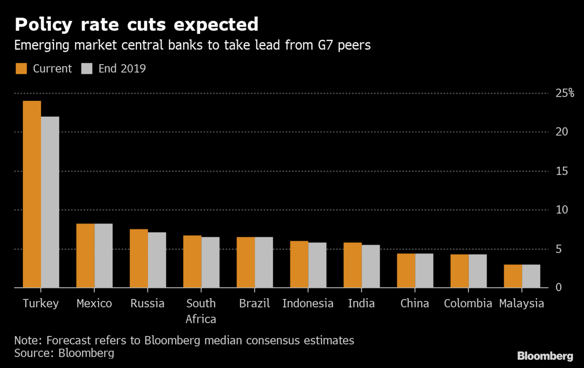 Central banks in Indonesia, South Africa, South Korea and Turkey are among those scheduled to make policy decisions over the coming weeks. Some of them across emerging markets have already shifted gears this year, with Russia, Chile, Malaysia, India and the Philippines lowering rates in recent months.