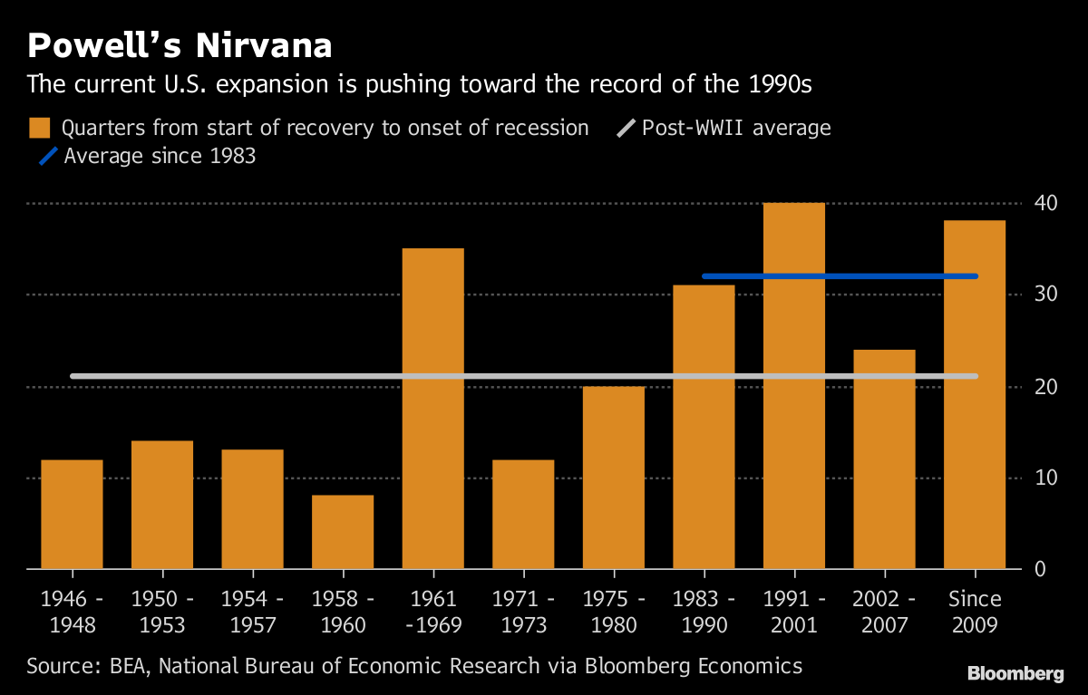 Federal Reserve Chairman Jerome Powell has said there’s “no reason to think that this cycle can’t continue for quite some time, effectively indefinitely.” But with the current U.S. expansion pushing toward its 114th month -- close to the 120-month record of the 1990s -- it’s worth asking what could bring it to an end. Trade wars and market blowups top Bloomberg Economics’ list of possible negative factors. Still, BE expects Powell’s nirvana of low unemployment, moderate inflation and sustained growth to continue for at least another year.