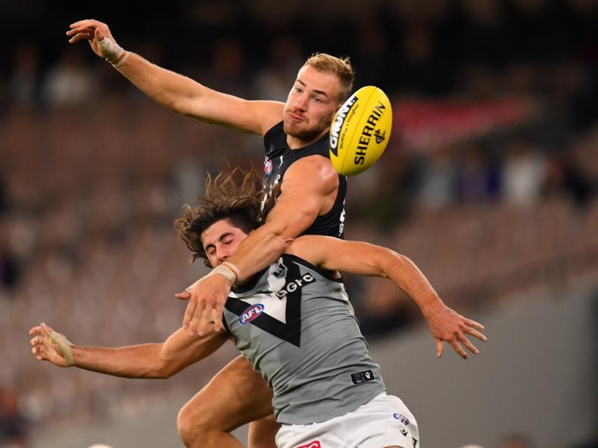 Carlton young gun Sam Walsh continued his great start to the year, racking up 29 touches and eight clearances and was well-supported by Patrick Cripps (27) while Eddie Betts had his moments in attack.