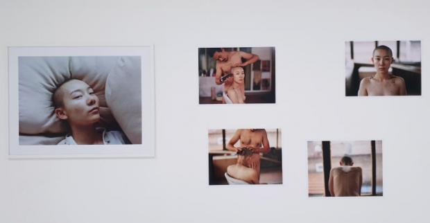 One set of photographs that stands out is a series of delicate portraits of Yang's friend Wang Yanyun. Starting with her looking unflinching into the camera while having her head shaved by a man who was her ex-boyfriend, later on she stands in a corner, alone, naked and pregnant. Soon after, she is playing in the bathtub with her young daughter as a single mother.
