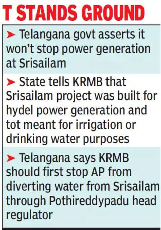 While Telangana said it would go ahead with hydel power generation at Srisailam, the KRMB directed the state to stop hydel power generation immediately. The board said it would discuss the power generation issue in another meeting, but AP insisted that the issue should be resolved immediately.