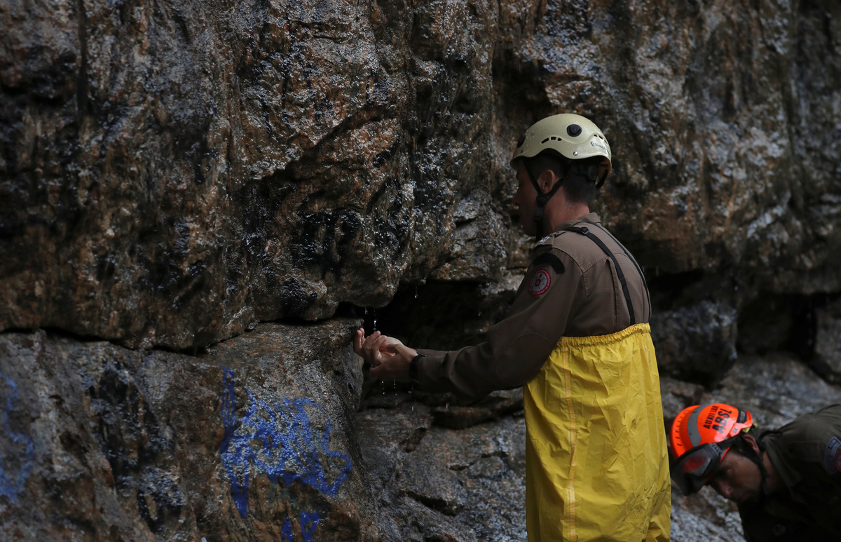A rescue worker washes his hands at the site of a mudslide, after heavy rains in Rio de Janeiro, Brazil, April 9, 2019. REUTERS/Ricardo Moraes