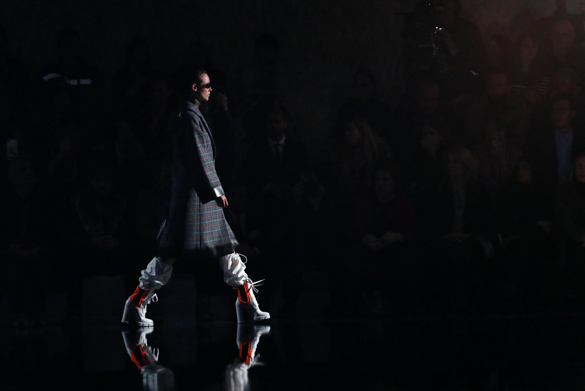 Models walked with the city skyline and train tracks as a backdrop, wearing oversize nylon and neoprene coats with wide shoulders from which delicate transparent dresses and tulle skirts peeped. All the models wore brightly colored tulle bows around their necks.