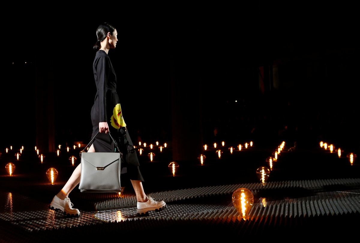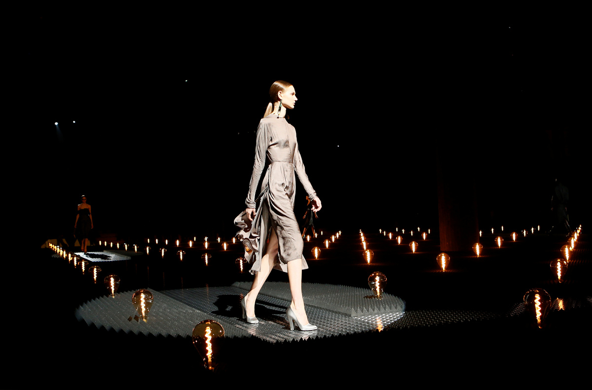 On a catwalk set amidst a field of lights, models first walked out in all black outfits - a strapless dress or belted coat - before softer floral touches began.