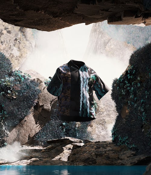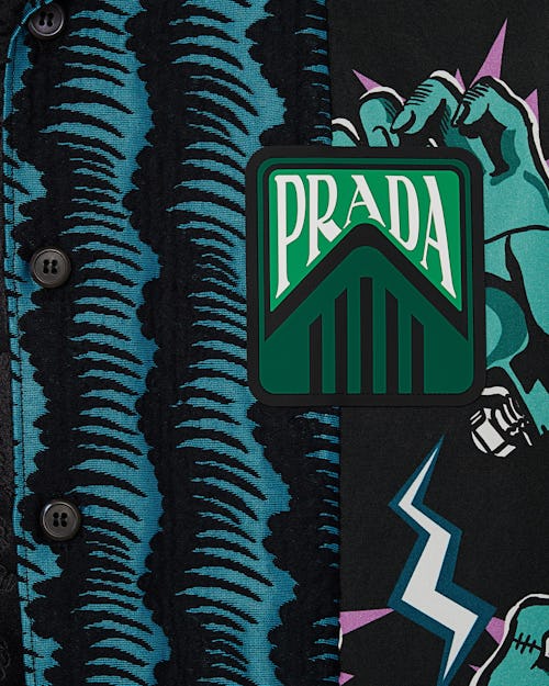 None of Prada’s Timecapsule shirts look the same, either. Constructed from black poplin, each top comes embellished with a selection of exclusive Prada fabrics, including a Frankenstein-inspired print created by artist Jeanne Detallante, a flower-motif silk lurex brocade, and a silk lampas textile from the brand’s 1920s archive. All designs are decorated with Prada’s Lattice Badge, altered to feature a graphic created by OMA Studio.