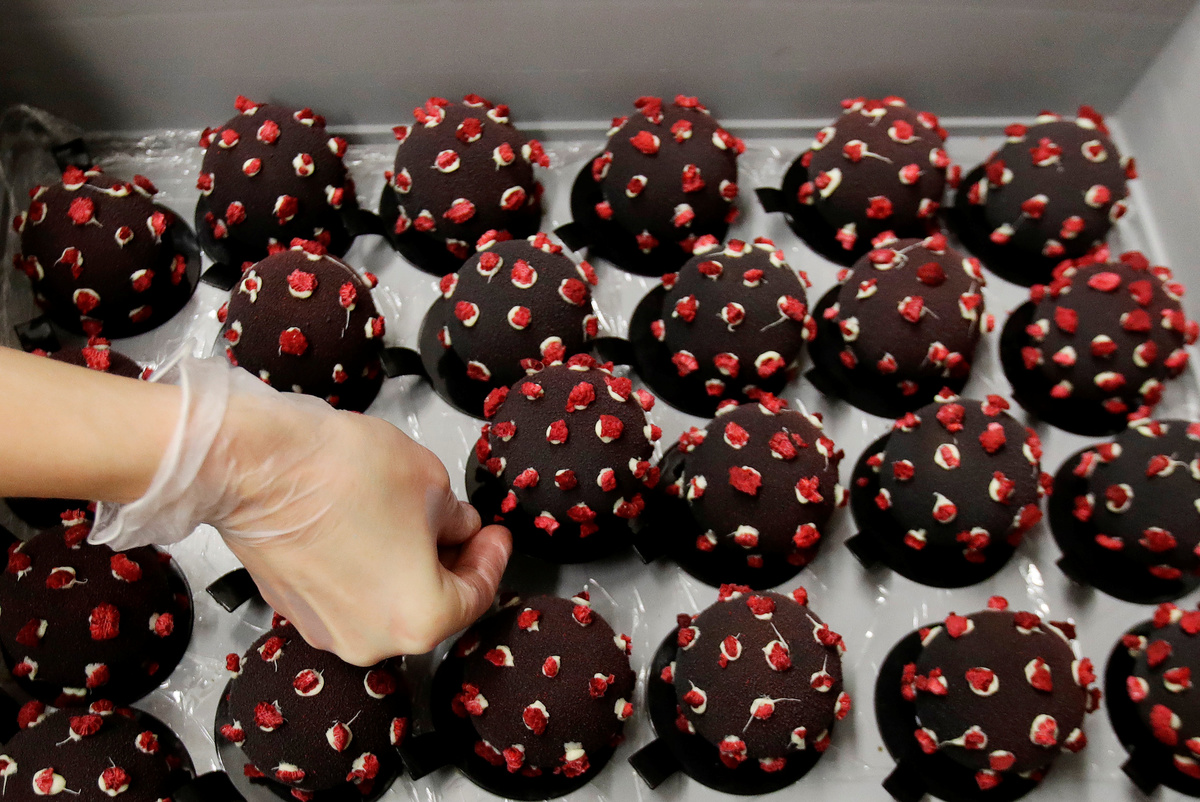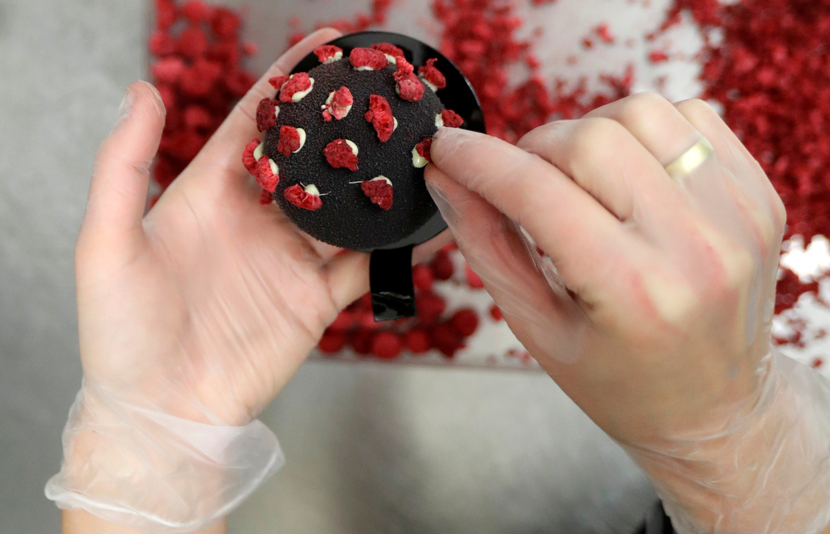 The dessert is slightly smaller than a tennis ball, with a chocolate crust and dusted with cocoa butter spray. The virus' "spikes" are made of white chocolate and dried raspberries.