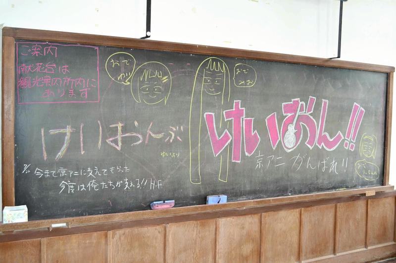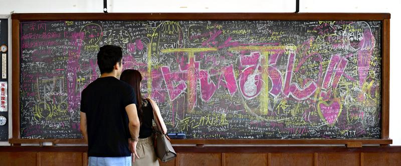 Messages of prayers for the souls of the people who died in the arson attack and for KyoAni's recovery are seen on a blackboard at a former building of Toyosato Elementary School in Toyosato, Shiga Prefecture, on Aug. 18. The school's buildings are said to have been a model for the school buildings in the anime "K-ON!!" that depicts the lives of high school girls in their school's pop music club. (Credit: The Yomiuri Shimbun)