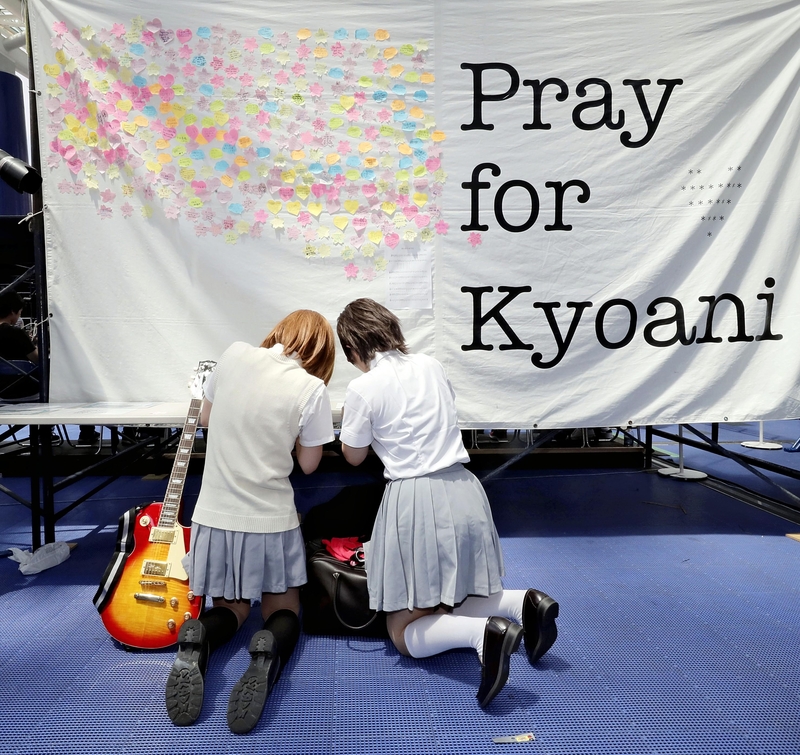 Women dressed as the heroines of the anime "K-ON!!" offer prayers in front of a tarp where people have written memorial messages for the victims of the arson attack, at the venue of the World Cosplay Summit in Nagoya on Aug. 4. "I think it will take a long time before KyoAni can get back on its feet, but I want to continue supporting KyoAni," one of them said. (Credit: The Yomiuri Shimbun)"Free!"