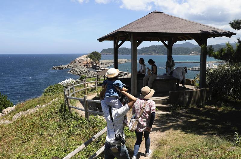 People on Aug. 13 visit an observation deck in Iwami, Tottori Prefecture, which is said to have been a model for some scenes in the "Free!" anime series depicting young swimmers who dedicate themselves to the sport. Many visitors have been coming to the deck since the arson attack. "I rediscovered the appeal of KyoAni's works," said a nurse from Matsuyama in her 20s. (Credit: The Yomiuri Shimbun)"Sound! Euphonium"