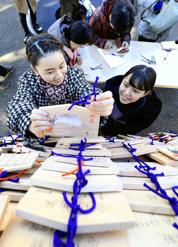Examinees and their families offer ema tablets to pray for success during entrance exam season at Yushima Tenmangu shrine, which is dedicated to Sugawara no Michizane, the deity of learning, in Bunkyo Ward, Tokyo, on Thursday. People who visited the shrine wrote, "Absolute passing" or "May my wishes come true," on an ema and tied it to a special place at the shrine.
