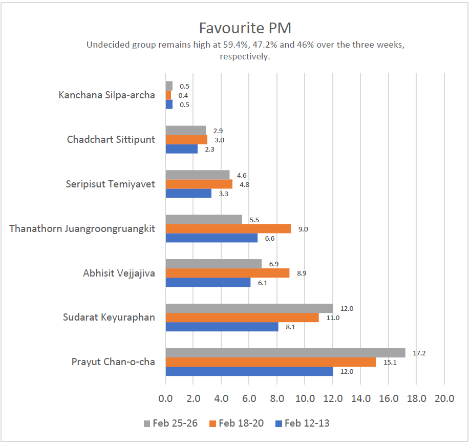 On the prime minister, 54% have already made up their mind and 17.2% of them want to see Gen Prayut in Government House.