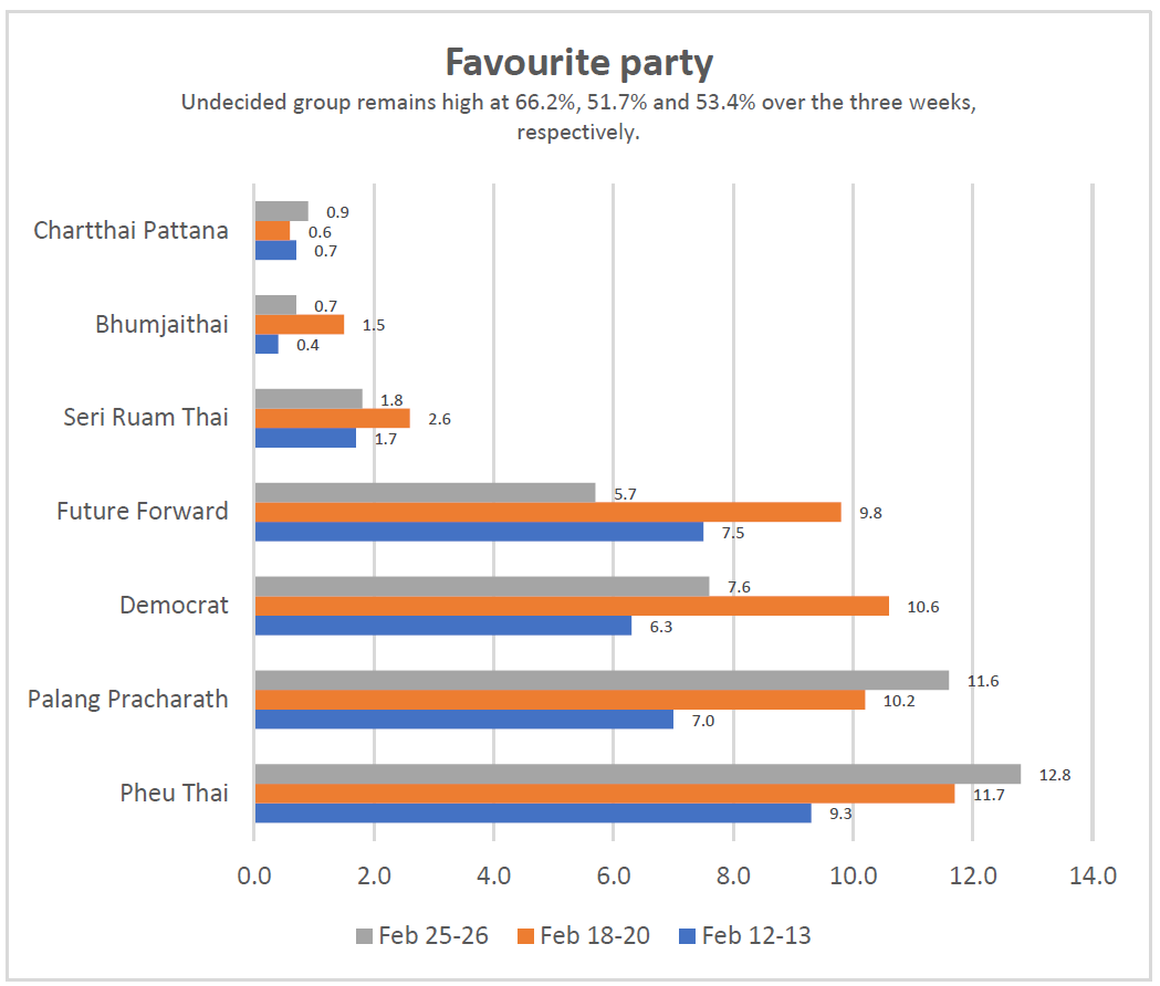 Pheu Thai continues to lead in an opinion poll as the favourite party in the March 24 election while Gen Prayut Chan-o-cha remains the favourite prime minister, according to the weekly Bangkok Poll.