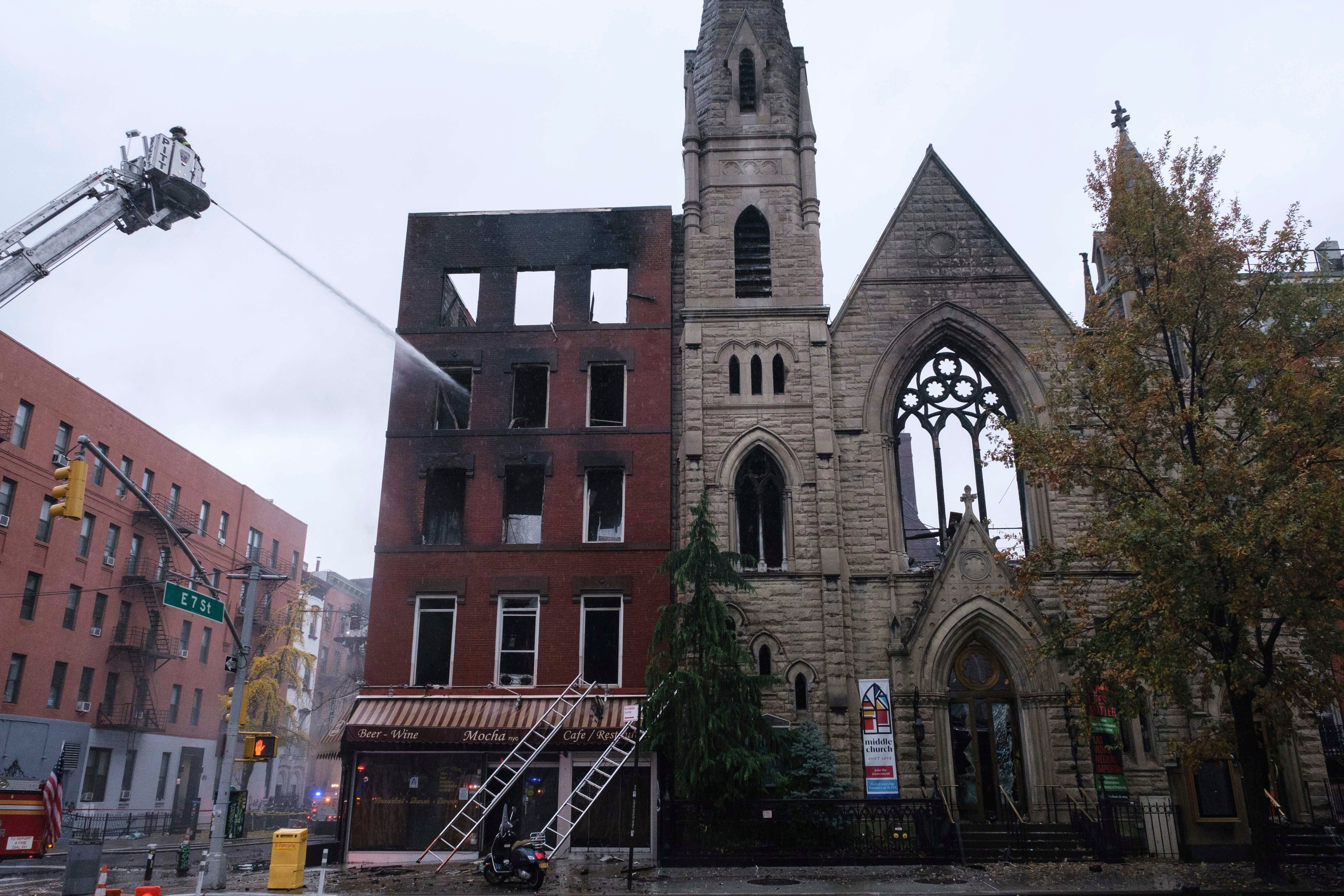 The Middle Collegiate Church, in Manhattan’s East Village, caught fire on Saturday morning after flames spread from a nearby apartment building.