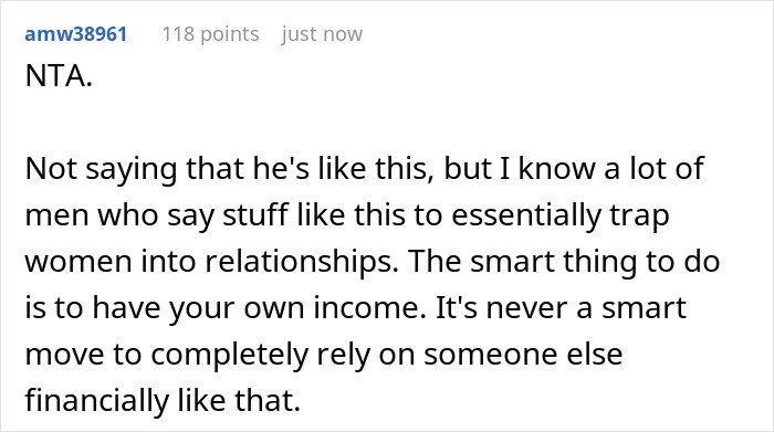 He liked that his mom stayed home and expected his GF to do the same, his plan was to take overtime and marry her so that she’d have “extra security”