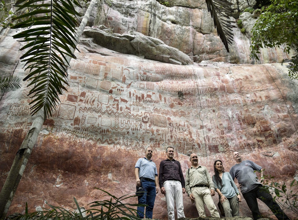 An eight-mile wall of prehistoric rock art featuring animals and humans has been discovered in the Chiribiquete National Park, Colombia, in the Amazon rainforest.