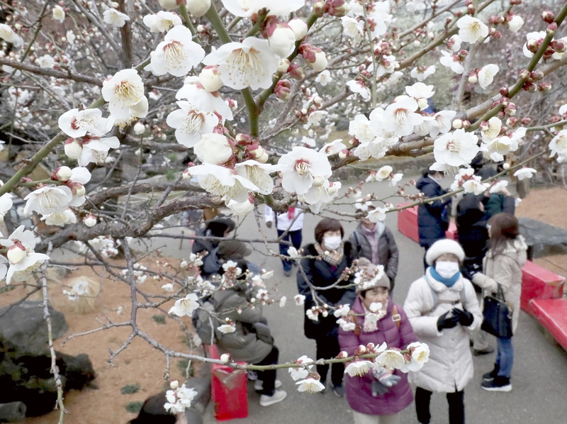 Visitors take in early-blooming ume blossoms during peak viewing season at Yushima Tenjin shrine in Tokyo, where the ume matsuri festival is being held. The shrine grounds are home to about 300 trees of about 20 different ume varieties, with many trees aged 70 to 80 years old. About 80 percent are shiraume that produce white blossoms. The Yomiuri Shimbun is a sponsor of the festival, which runs through March 8.