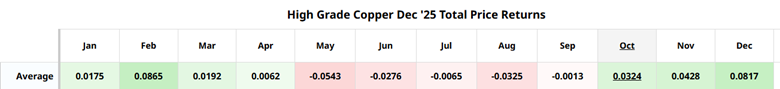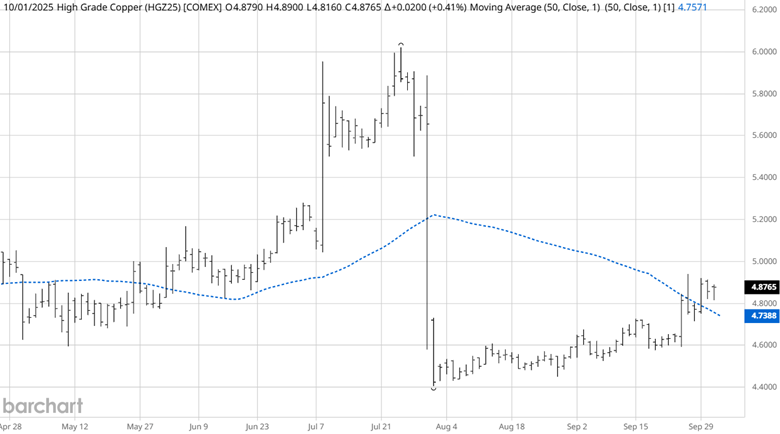 The50% tariffs imposed in August had a significant impact on copper prices. Copper has spent the last two months consolidating the waterfall price collapse. Recently, prices appeared to have broken out of the congestion. The 50-day simple moving average (SMA) is still sloping down, but prices are trading higher, which, if they continue, will result in the SMA turning higher, supporting higher copper prices. Recently, price action has had multiple higher highs and higher lows, albeit not with significant price gains. As we will address in the upcoming seasonal section, the fall season has traditionally been a springboard for higher copper prices. Will copper have a sympathy rally to participate with its fellow metals?