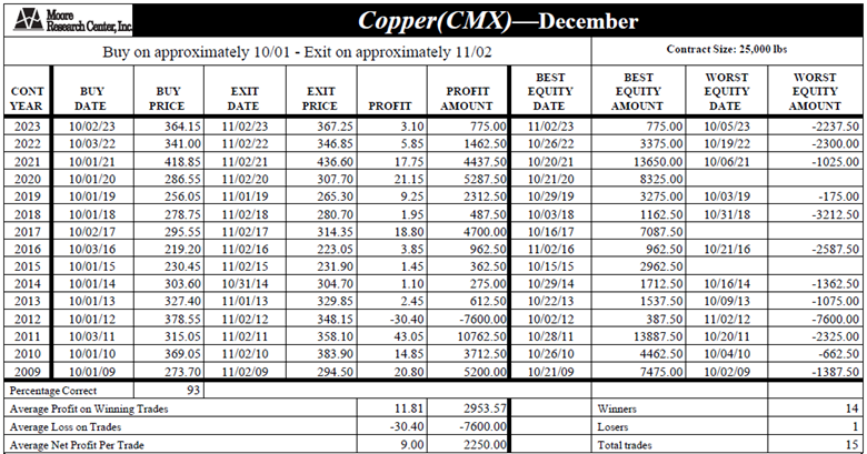 MRCI released this research in their Historical Metals Report to refine the seasonal window for buying copper. Through research, they could test and show that copper prices have closed higher on November 02 than October 01 for 14 of the recent 15 years, 93% occurrence. Also, I'd like to point out that three of those years never had a daily closing drawdown.
