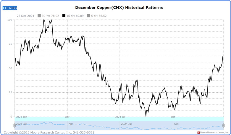 The 15-year seasonal average for copper prices shows that copper prices have historically peaked near March and bottomed in September or October, creating extensive moves from these periods. The timing of the basing pattern from August until now, after the significant price drop, agrees with the seasonal pattern. Now that prices attempt to break out to the upside, will the seasonal pattern be a tailwind for higher prices?