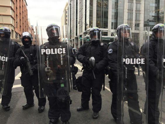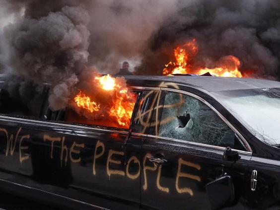 Just a couple of hours before Mr Trump sat and watched a military parade and prepared to head off to the traditional inaugural balls, protesters had clashed with riot police in streets not far away, an event unprecedented at a presidential inauguration. Protesters set fire to at least one vehicle and smashed windows, while police fired tear gas and pushed people back with shields. More than 200 people were arrested and six police officers were hurt.
