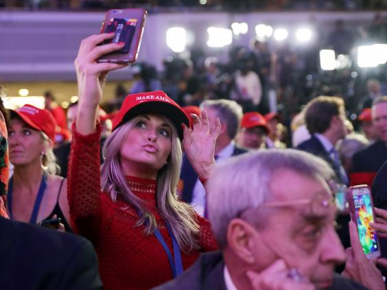 A trump supporter pauses to take a selfie amid high tension at Trump's election night event at the New York Hilton Midtown