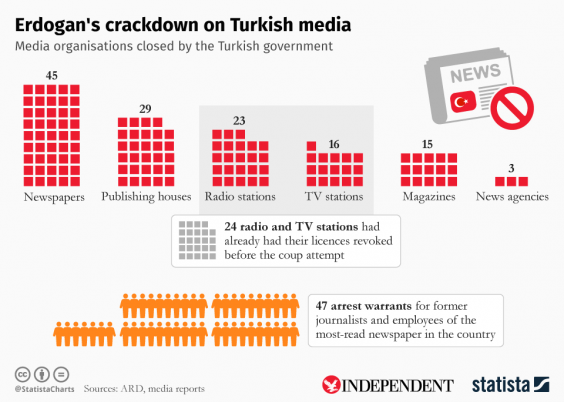 The graph made for The Independent by Statista also highlights the 47 arrest warrants issued for journalists who worked for the Zaman newspaper.