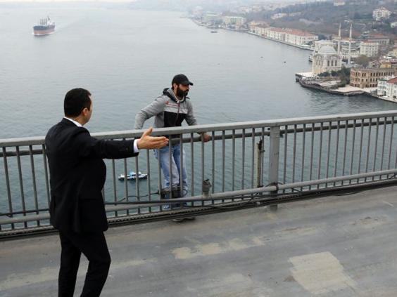 Extraordinary television footage obtained Anadolu Agency shows Mr Erdogan's motorcade stopping on Istanbul's Bosporus Bridge after spotting a man standing over the side of the railing. He was reportedly planning to jump, according to Turkish officials.