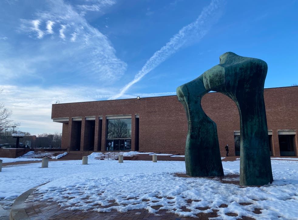 J. Irwin Miller, who ran the giant Cummins plant at the time, gave the money on the condition that the buildings were designed by great architects. The town is filled with mid-century modernist masterpieces by Harry Weese, Eero and Eliel Saarinen, Cesar Pelli, Richard Meier, Robert Venturi and James Polshek. Flynn is standing in front of the city library by I.M. Pei, in front of which is a sculpture by British artist Henry Moore.