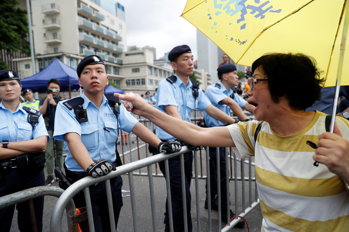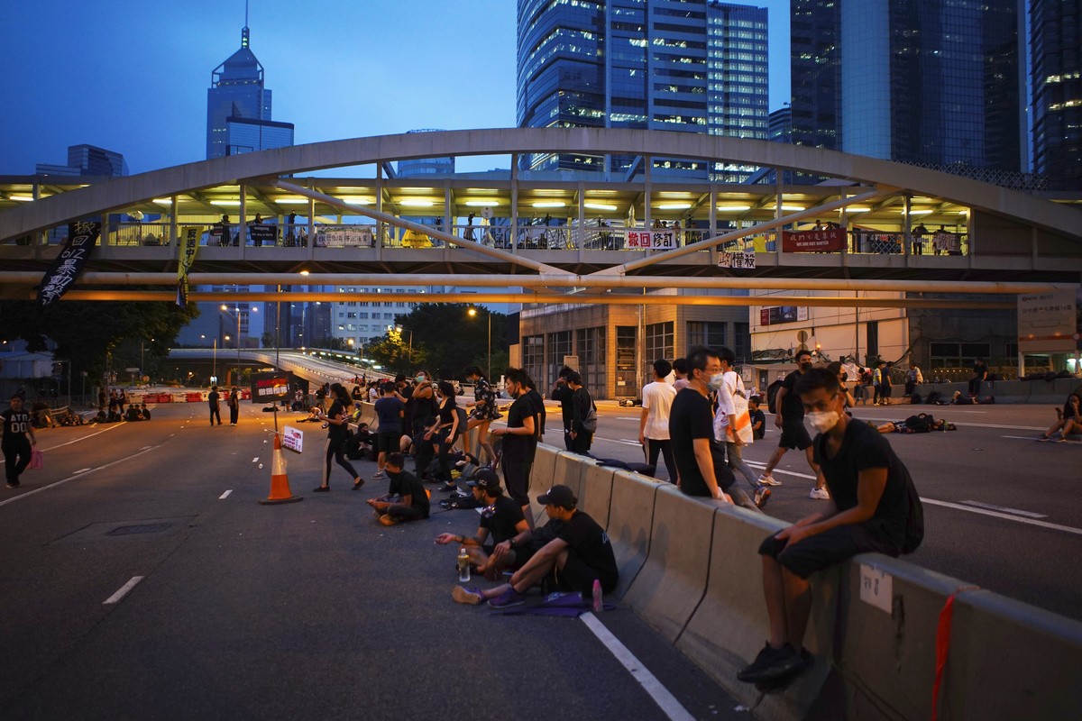 On Monday, protesters near the government's offices blocked roads and urged Lam to withdraw the bill, release arrested students, drop the official description of a rally on Wednesday that involved clashes with the police as a riot, and step down.