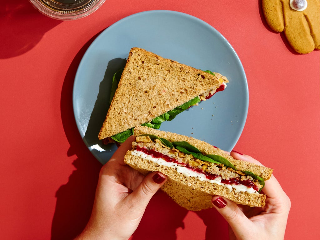 The seasonal sarnie is comprised of turkey with a port and orange cranberry sauce, herby pork stuffy, baby spinach, mayo and crispy onions, encased in thick-cut bread.