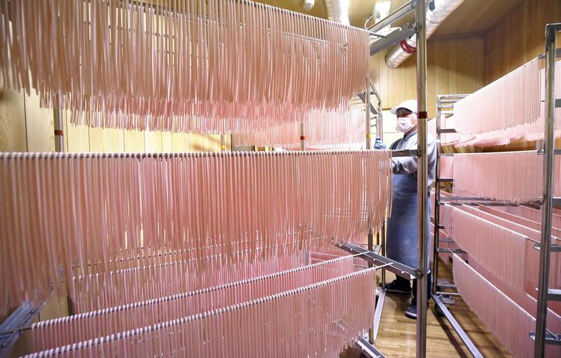 Pink udon noodles hang to dry at noodle maker Misumi Seimen Kojo's factory in Asakura, Fukuoka Prefecture. The company's "sakura udon" have been sold exclusively during spring to mark cherry blossom season for about 20 years. The company began production this month, with extract from cherry leaves and natural coloring kneaded into the dough.
