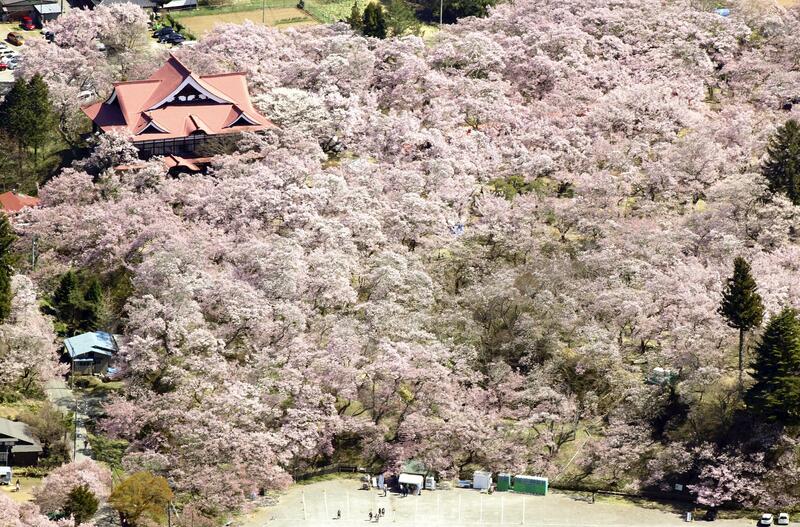 Takato Castle Site Park in Nagano Prefecture, known as a local spot for cherry blossom viewing, is awash in soft tints of reddish pink as its 1,500 or so cherry trees have come into full bloom.