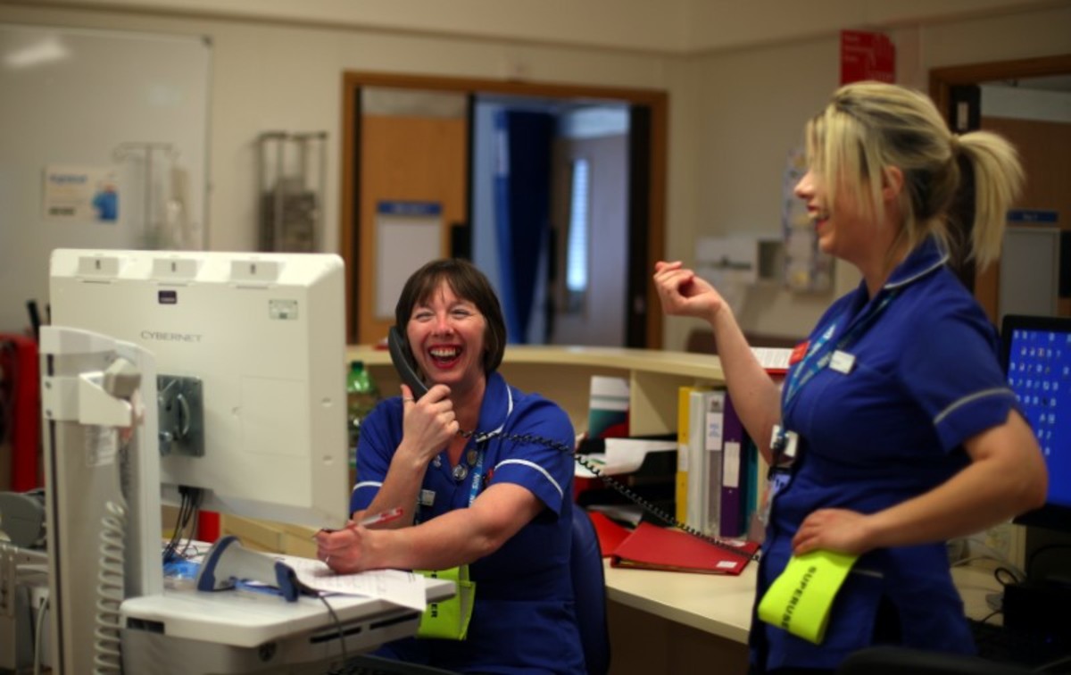 Nurses Josephine Warner and Hannah Hall work in the nurses station in Ward 24 at Milton Keynes University Hospital in Milton Keynes, central England, Britain, May 22, 2018. REUTERS/Hannah McKay