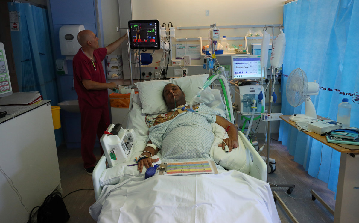 A hospital worker assesses a patient in the Critical Care Unit at Milton Keynes University Hospital in Milton Keynes, central England, Britain, June 6, 2018. REUTERS/Hannah McKay