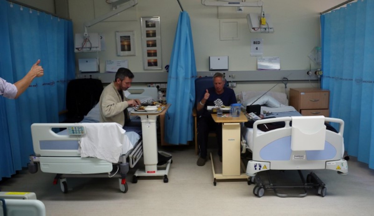 Inpatients David Corstorphino (L) and David Popplewell eat their lunchtime meal on Ward 8 of Milton Keynes University Hospital in Milton Keynes, central England, Britain, June 6, 2018. REUTERS/Hannah McKay