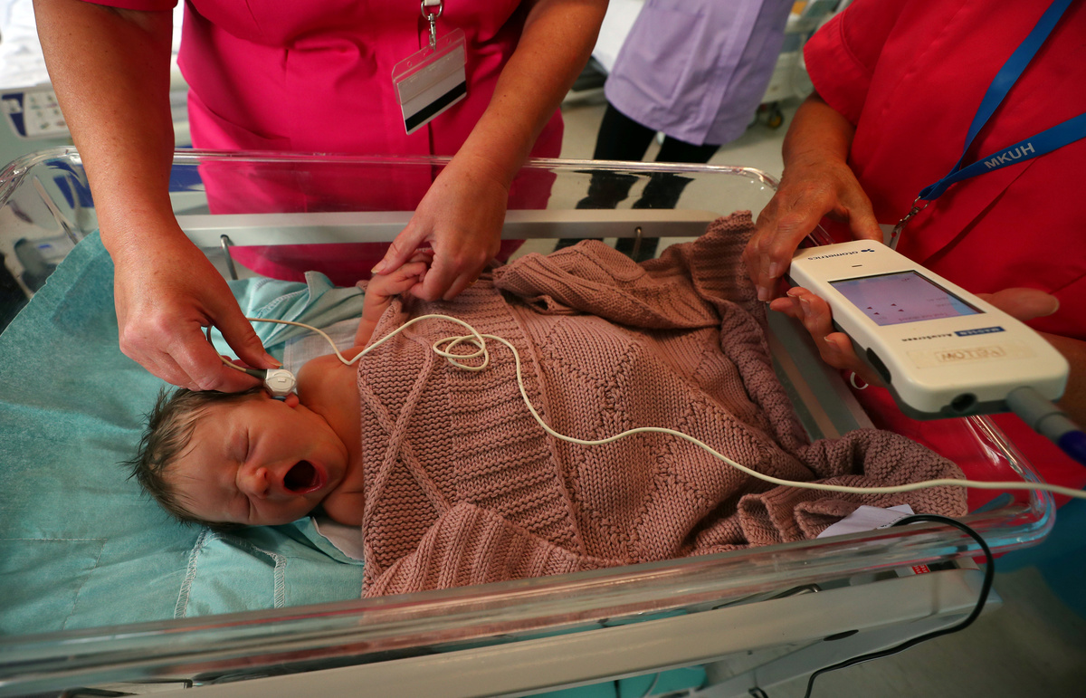 Nurses check the hearing of a newborn baby during a hearing test in Milton Keynes University Hospital in Milton Keynes, central England, Britain, May 23, 2018. REUTERS/Hannah McKay