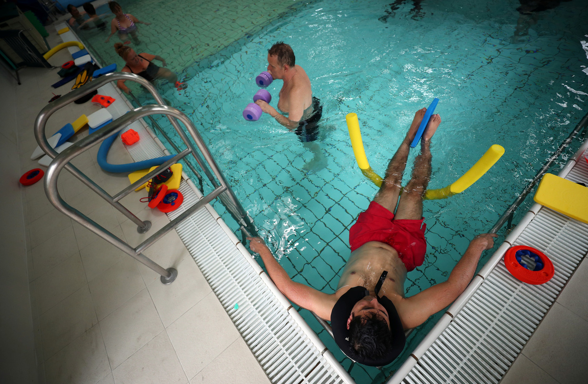 Patients participate in a physiotherapy class in the hydrotherapy pool in the Physiotherapy department at Milton Keynes University Hospital in Milton Keynes, central England, Britain, June 8, 2018. REUTERS/Hannah McKay