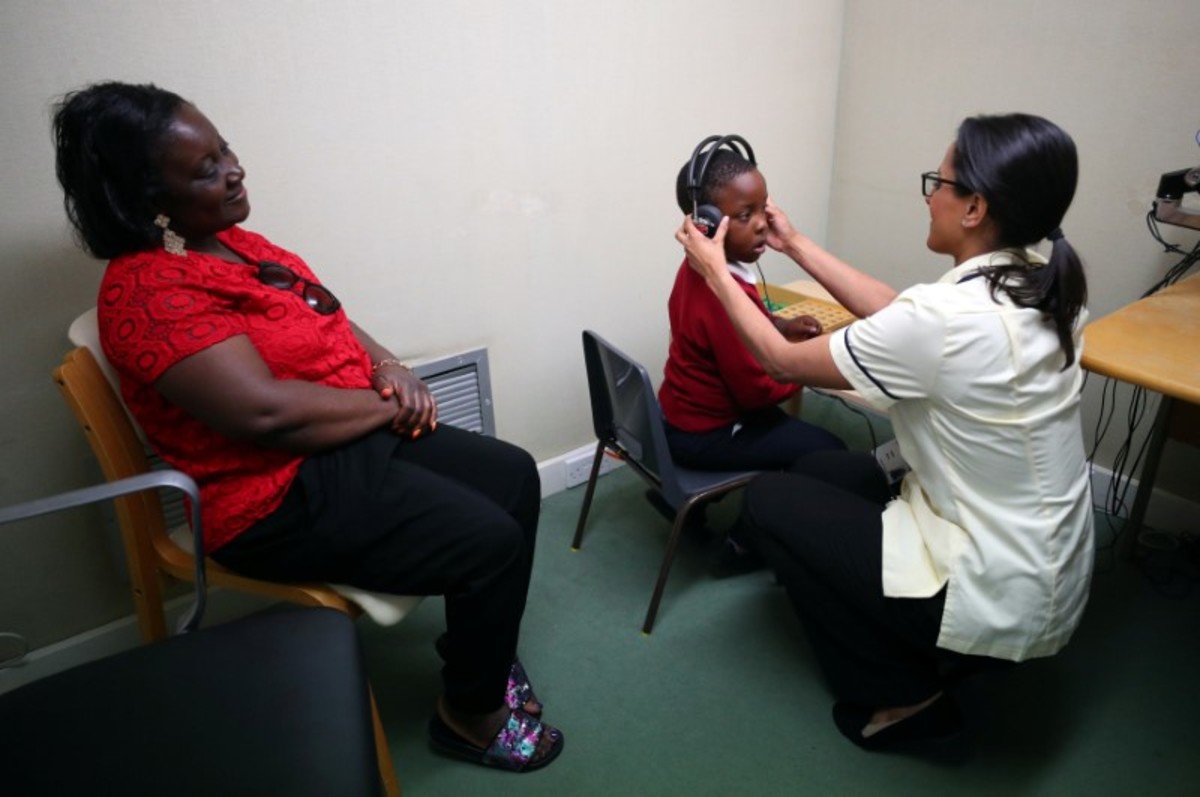 Elizabeth Nomhwange observes her son, Moses Aloho, having a hearing test during an appointment at the Audiology department in Milton Keynes University Hospital in Milton Keynes, central England, Britain, May 22, 2018. REUTERS/Hannah McKay