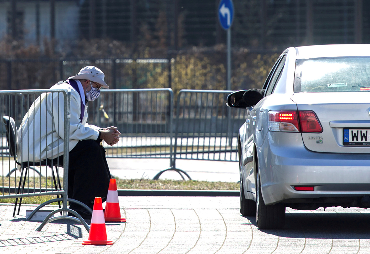 Sitting on a chair and wearing a surgical mask, Father Mateusz Kielarski listens to his parishioners and gives them absolution as they lean out of their car windows.