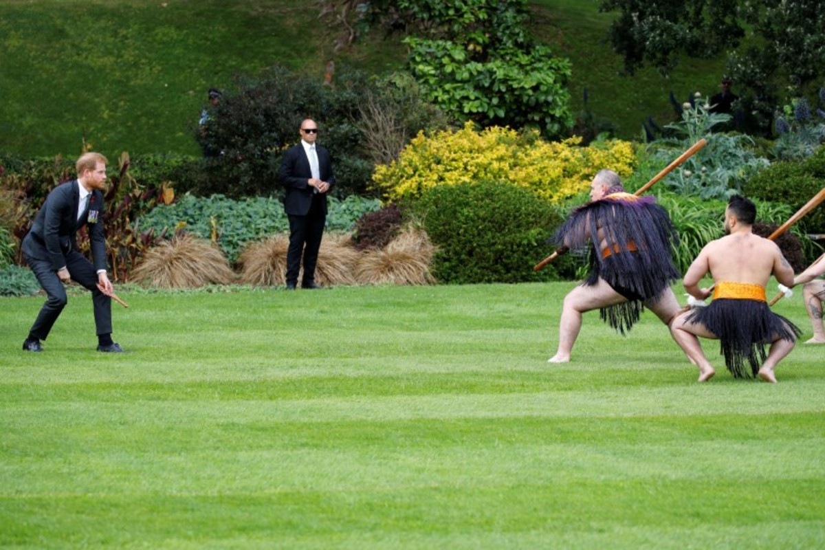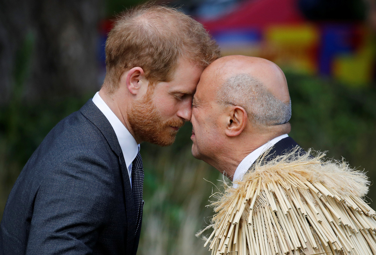 Harry and Meghan rubbed noses with Maori leaders in a traditional "hongi" greeting and were welcomed by a "haka", a centuries-old tribal war dance, to salute and honor them. A 21-gun salute was also sounded.