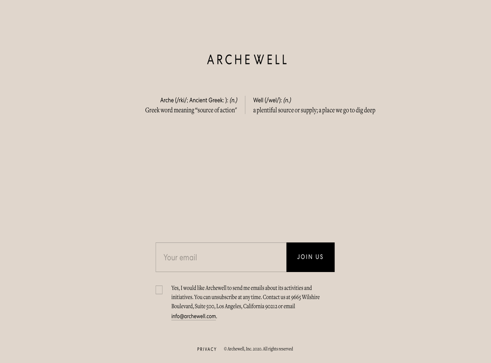 When visiting Archewell.com, people are greeted with a minimalist landing page that features a solid-taupe background and the word Archewell broken down phonetically.