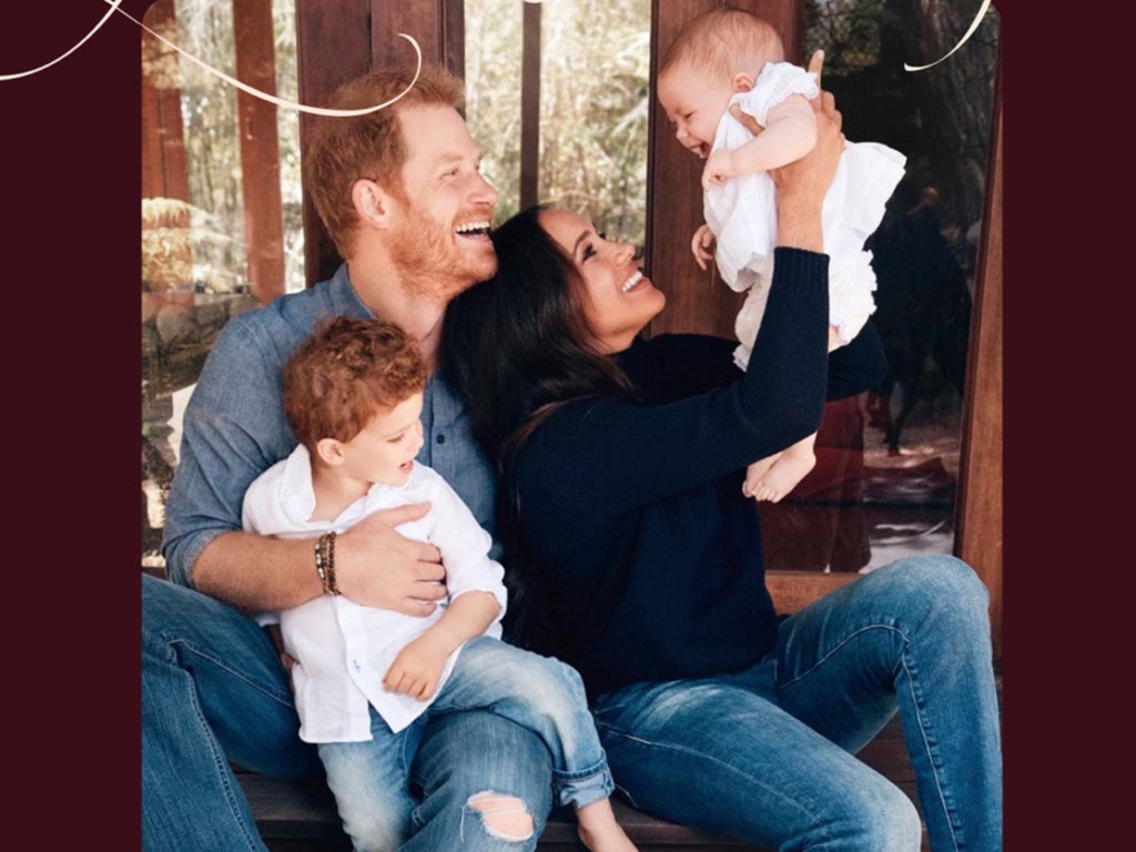 The Duke and Duchess of Sussex shared the family photograph, taken by Alexi Lubomirski, on Thursday, with the card showing the family of four wearing jeans and smiling outside their home in Santa Barbara, California.
