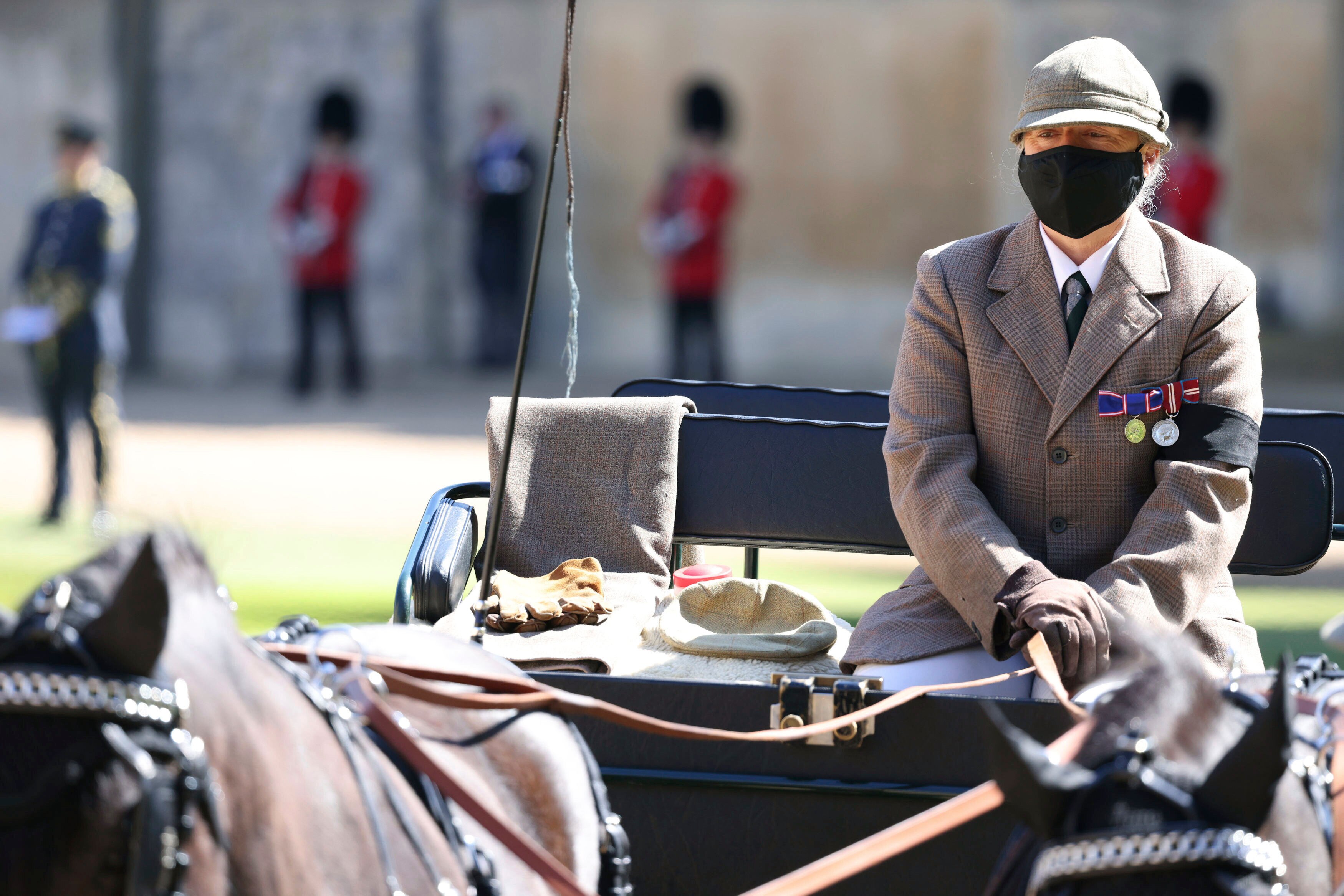 An expert carriage driver, Prince Philip's beloved Fell ponies, Balmoral Nevis and Notlaw Storm, stood in the quadrangle during the funeral procession.