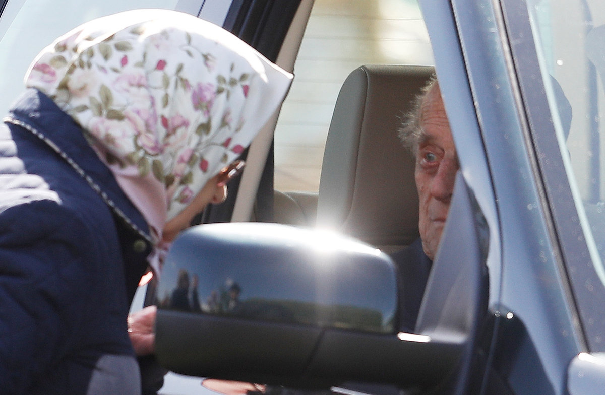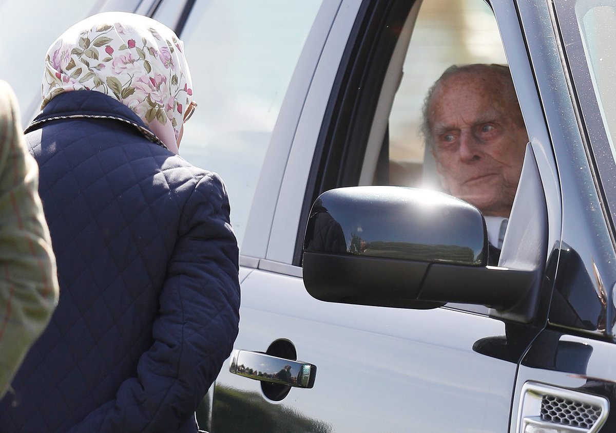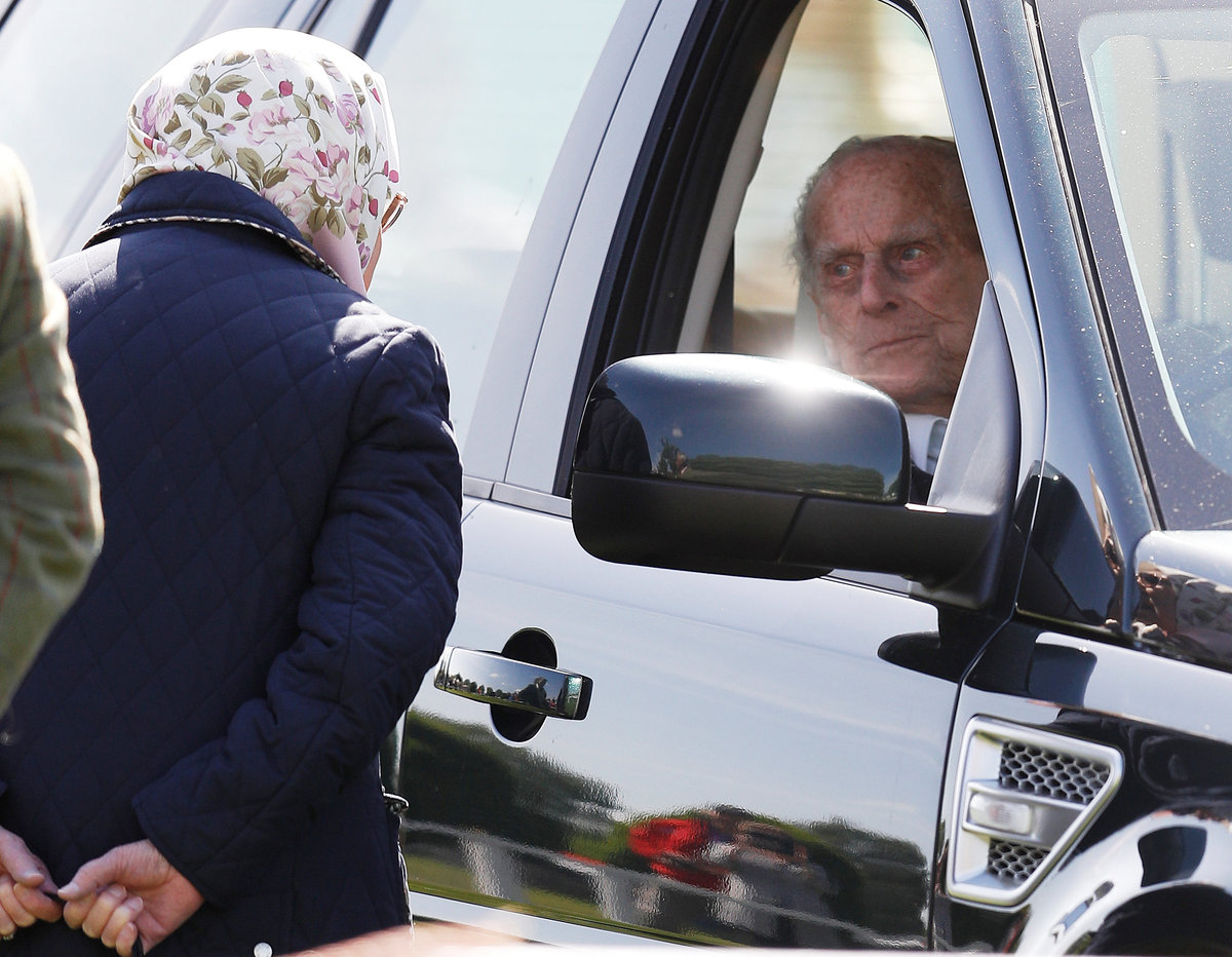 Former naval officer Philip sat behind the wheel of a black Land Rover at the Royal Windsor Horse Show and chatted to the queen.