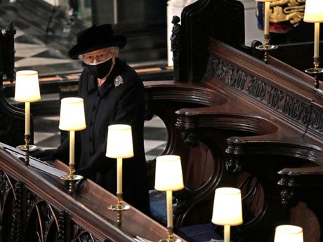 The Queen, who once described her partner as her “strength and stay”, sat alone throughout the ceremony, with a black mask covering her face throughout the service as the dean of Windsor spoke of her husband’s “kindness, humour and humanity” over the course of his life.